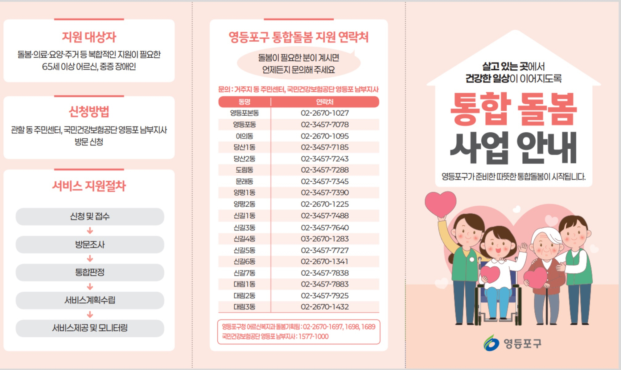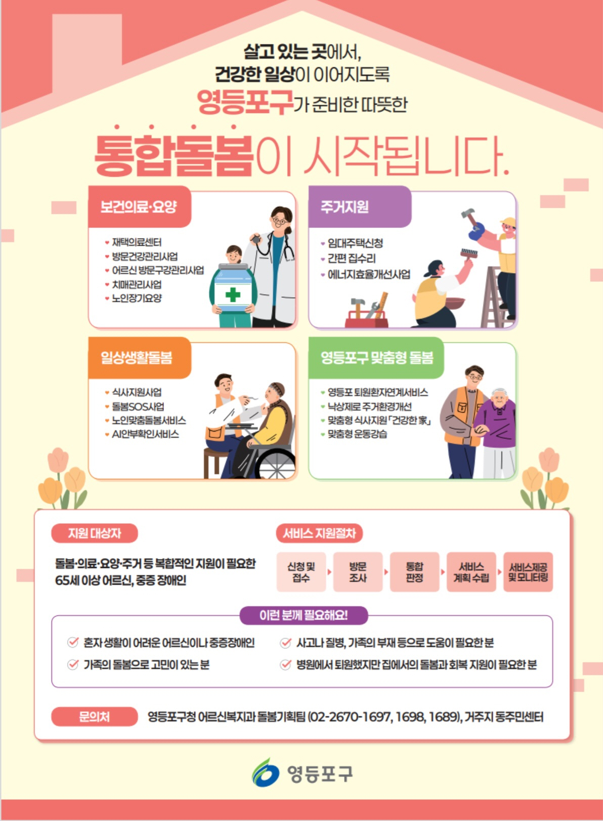 영등포구(구청장 최호권)가 오는 27일 전국적으로 ‘지역사회 통합돌봄 제도’가 시행됨에 따라 의료·요양·돌봄 서비스를 한 번에 제공하는 ‘영등포형 통합돌봄’ 사업을 본격 추진한다고 밝혔다.