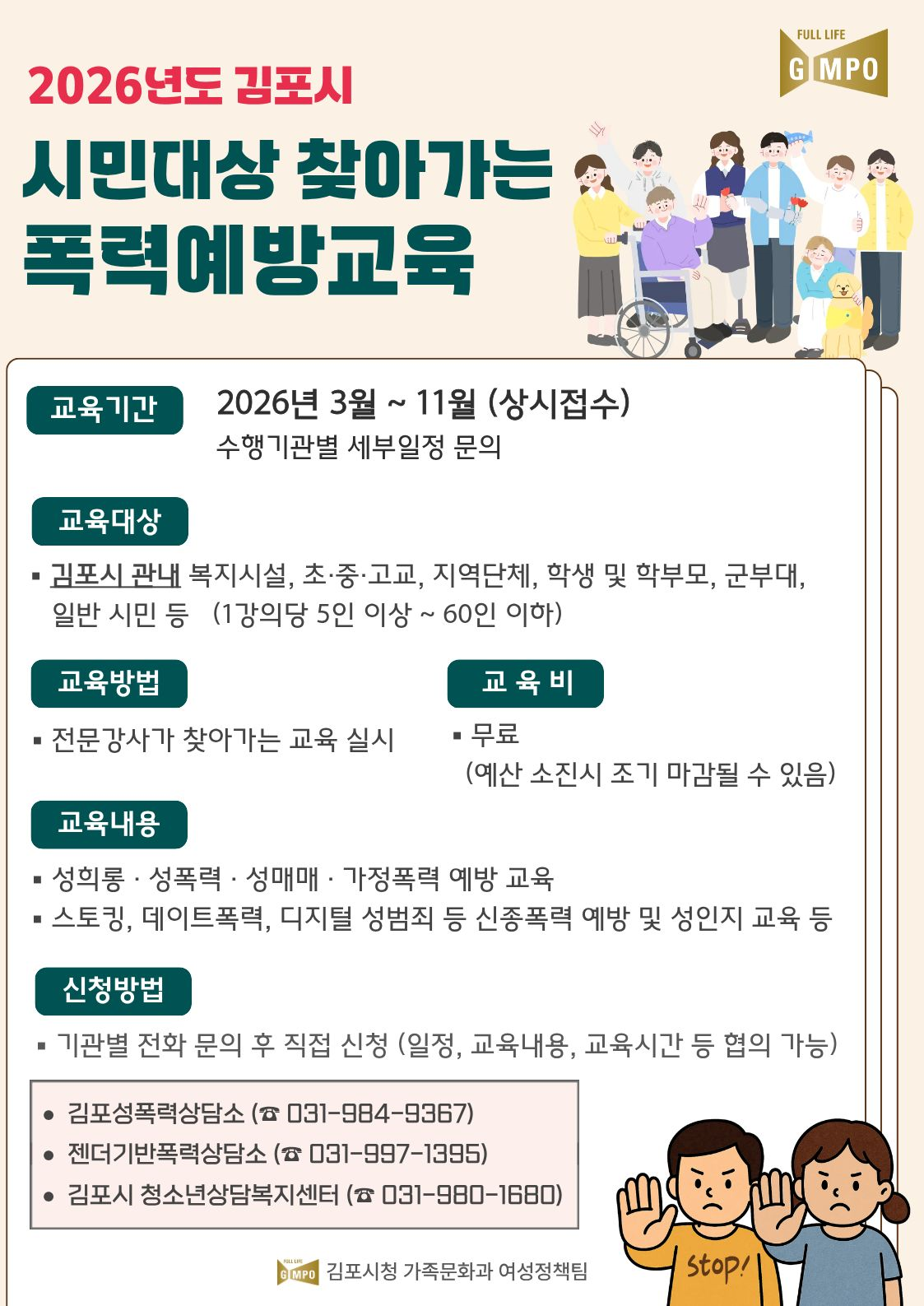 [김포시소비자저널=홍완호 대표기자] 김포시(시장 김병수)는 시민의 건전한 성 가치관 형성과 폭력 예방 의식 확산을 위해 ‘2026년 김포시 시민대상 폭력예방교육’ 사업을 3월부터 11월까지 추진한다고 밝혔다.