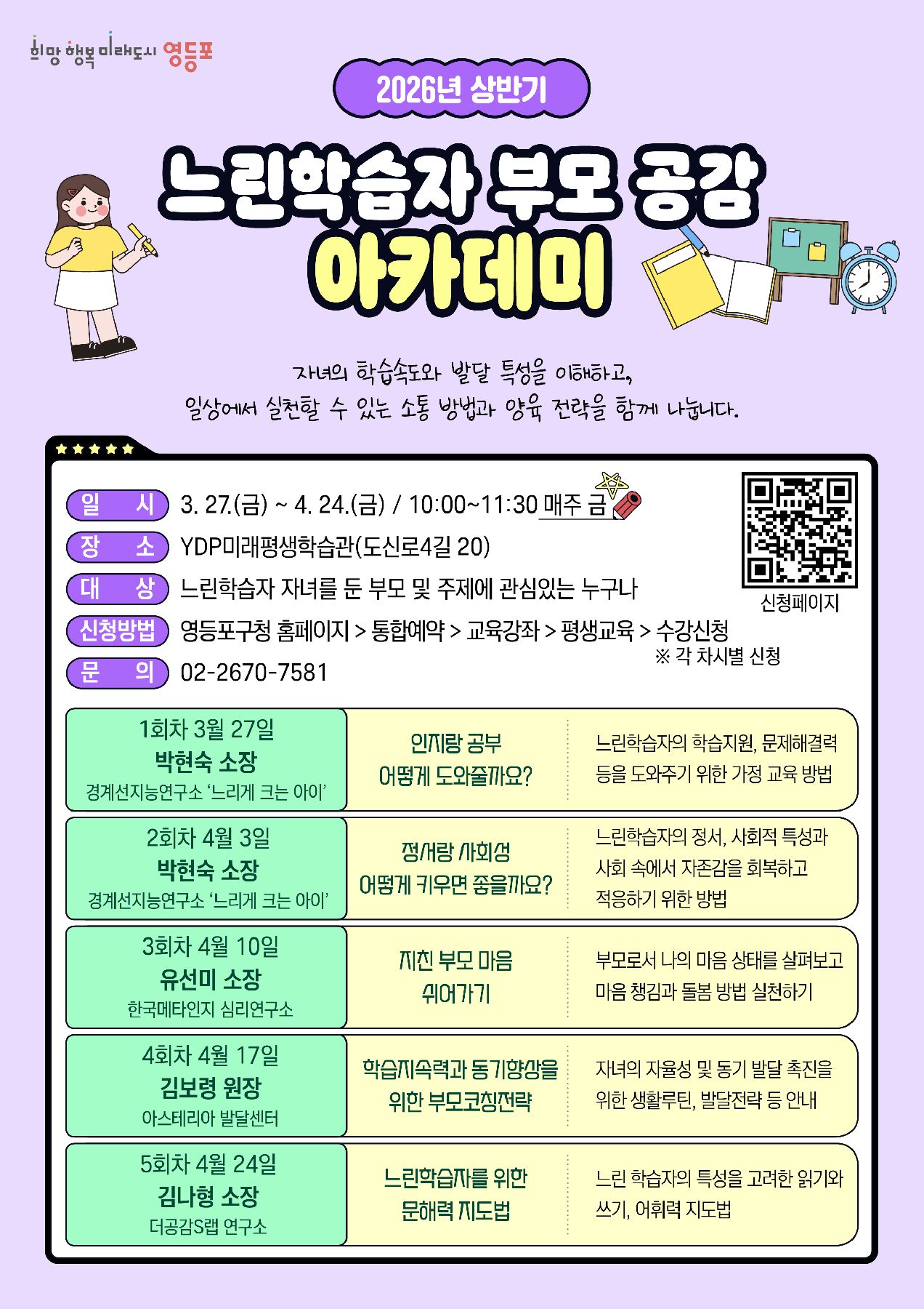 교육은 3월 27일부터 4월 24일까지 매주 금요일 오전, YDP미래평생학습관에서 총 5회에 걸쳐 진행된다. 느린학습자 자녀를 둔 부모는 물론, 관련 주제에 관심 있는 누구나 참여할 수 있다.