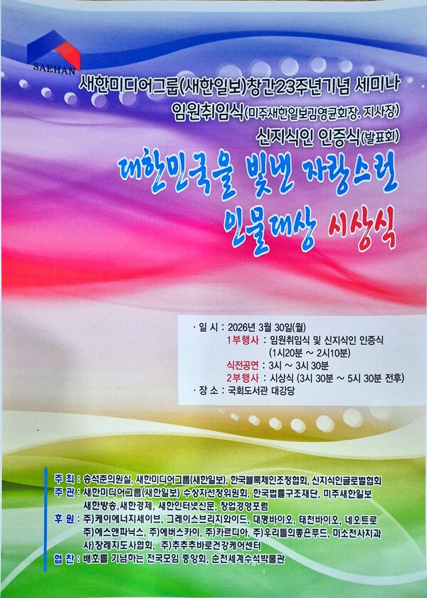 이번 행사는 송석준의원실, 새한미디어그룹(새한일보), 사)대한블록체인조정협회, 신지식인글로벌협회 등이 공동 주최하고, 새한미디어그룹(새한일보)과 수상자선정위원회 및 한국법률구조재단, 비영리단체 창업경영포럼, ESM소비자평가단(DAO)이 등이 공동으로 주관한 대한민국을 빛낸 자랑스런 인물대상 시상식」이 2026년 3월 30일 오후 2시부터 서울 국회도서관 대강당에서 성황리에 개최됐다.