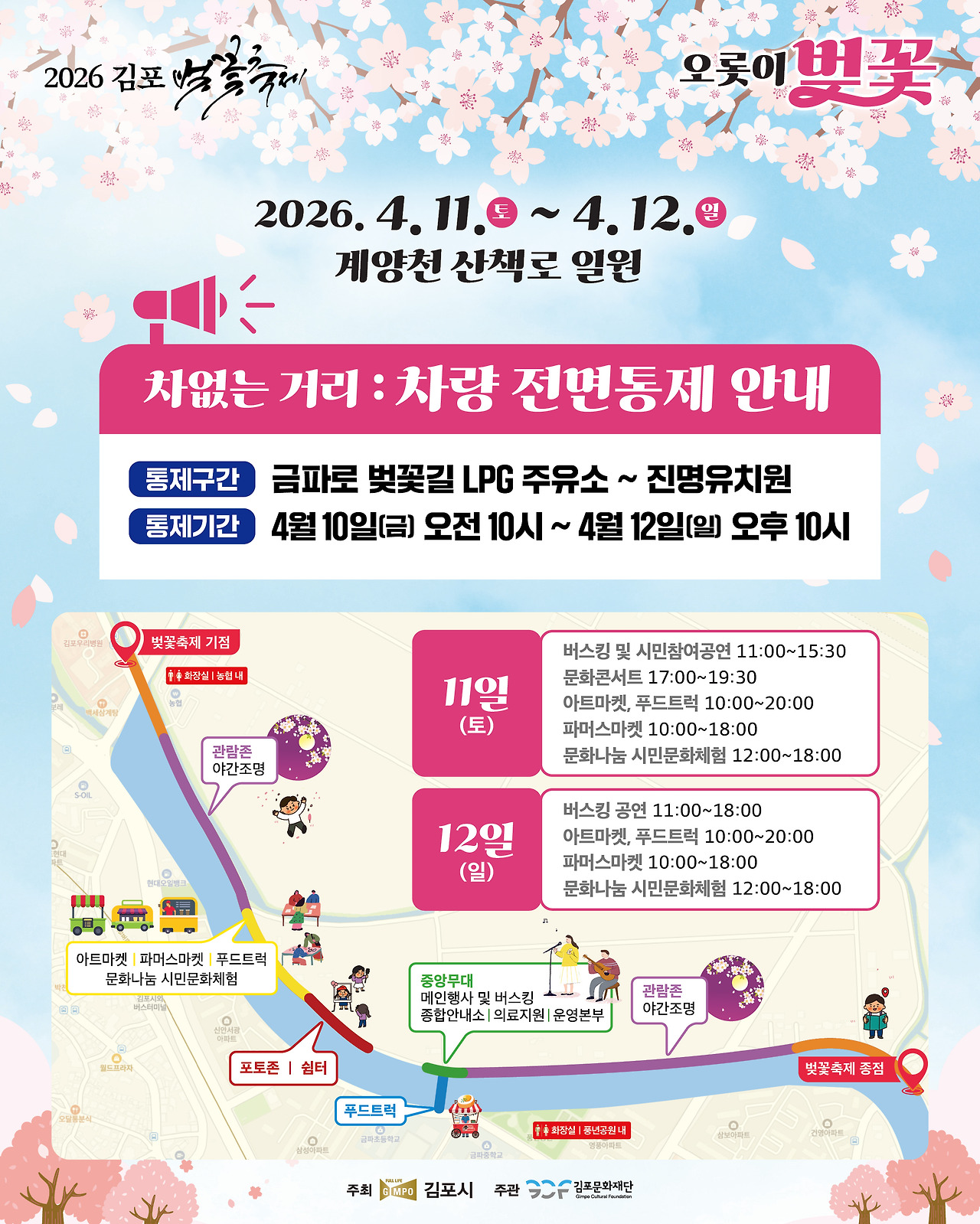 [김포시소비자저널=홍완호 대표기자] 김포시(시장 김병수)가 오는 4월 11일(토)부터 12일(일)까지 양일간 계양천(김포본동~사우동 구간) 일원에서 ‘2026 김포 벚꽃축제’를 개최한다고 밝혔다.