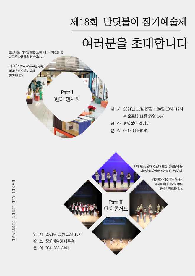 반디콘서트는 12월 11일 15시 용인시 문화예술원 마루홀에서 방역수칙을 철저히 준수하고 대면으로 진행하며 기타, 댄스, 퓨전농악, 칼림바, 반디스틱, 합창 등으로 구성되어 공연 이후 영상으로 게시될 예정이다.