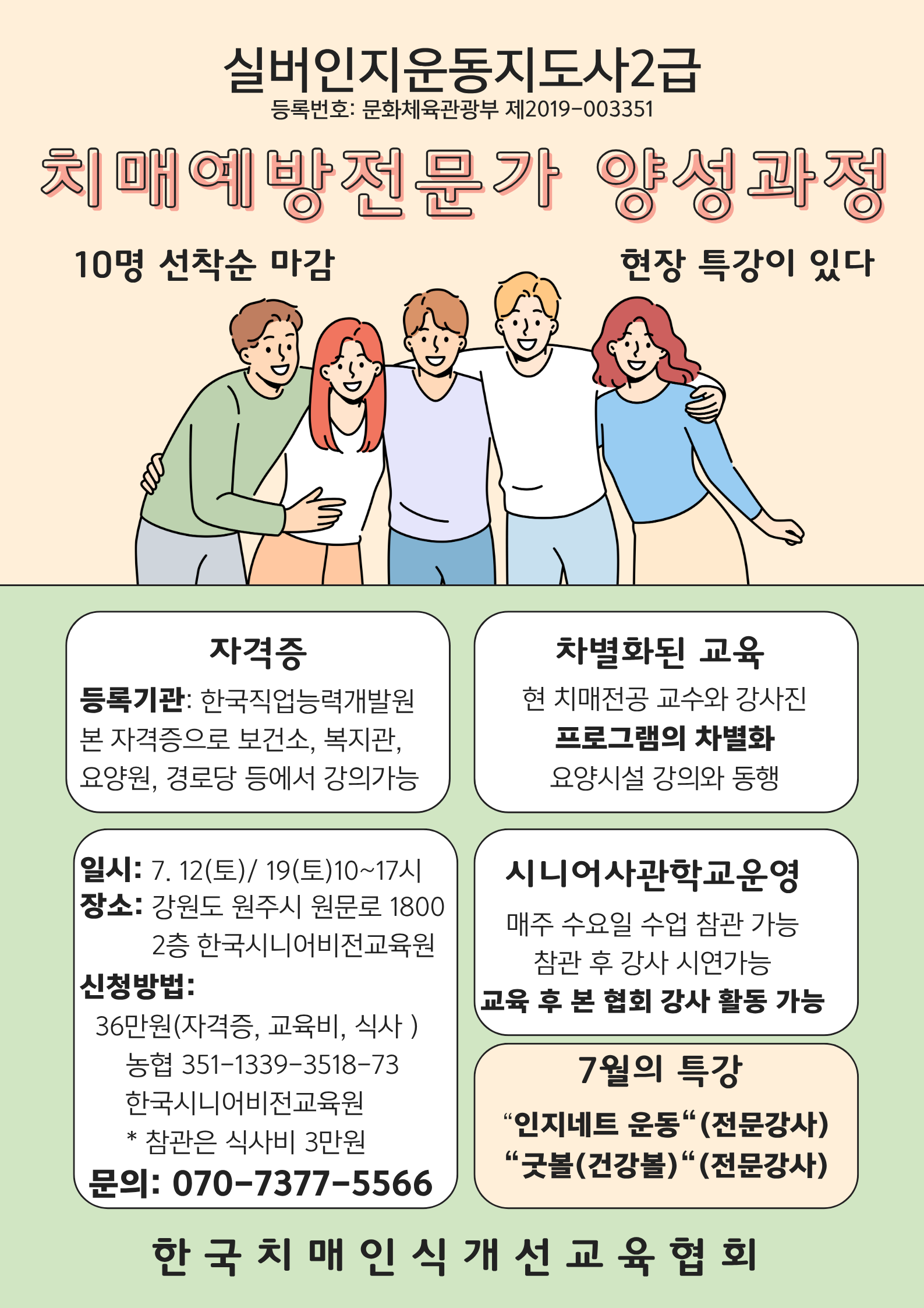 실버복지 분야 취.창업 기회! 치매예방전문가 과정 7월 원주 개강
