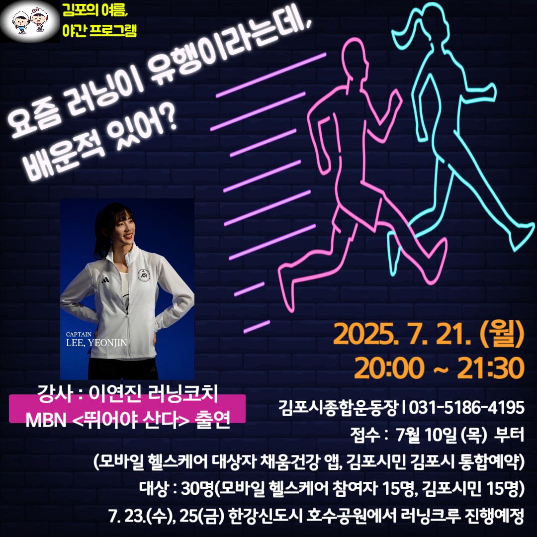 이번 프로그램은 7월 21일(월) 저녁 8시 김포시종합운동장(사우동)에서 열리는 ‘이열치열 러닝특강’으로 시작한다. 이번 특강에는 MBN <뛰어야 산다>에 출연 중인 이연진 러닝 코치를 초청하여 달리기의 기본 자세와 안전한 운동을 위한 스트레칭 등 실습 위주의 프로그램을 진행한다. 특히 달리기를 처음 접하는 시민들도 쉽게 참여할 수 있도록 구성되어, 일상 속 건강 실천에 대한 동기 부여의 기회가 될 것으로 기대된다.