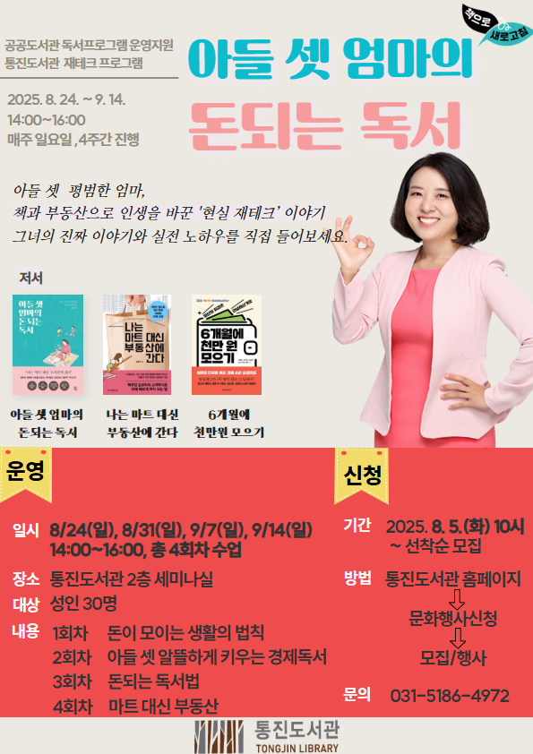 강의 내용은 ▲자녀 교육비 부담을 줄이는 전략 ▲아들 셋 알뜰하게 키우는 경제독서 ▲수익으로 연결되는 실전형 독서법 ▲무리하지 않고 투자하는 방법 등으로 구성해 복잡한 이론보다 생활 중심의 사례를 통해 누구나 공감하고 실천할 수 있는 내용로 진행된다.