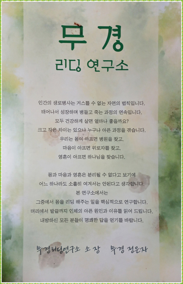 [강남 소비자저널=정현아 기자] 지난 23일, 경기 광주시 남종면 팔당호가 내려다보이는 리딩연구소에서 특별한 만남이 있었다. 바로 땅속의 수맥과 기(氣)의 흐름을 읽고, 나아가 사람의 몸까지 리딩한다는 무경쌤이다. 그는 자신만의 독특한 연구를 통해 사람들의 건강을 돕고 있다.