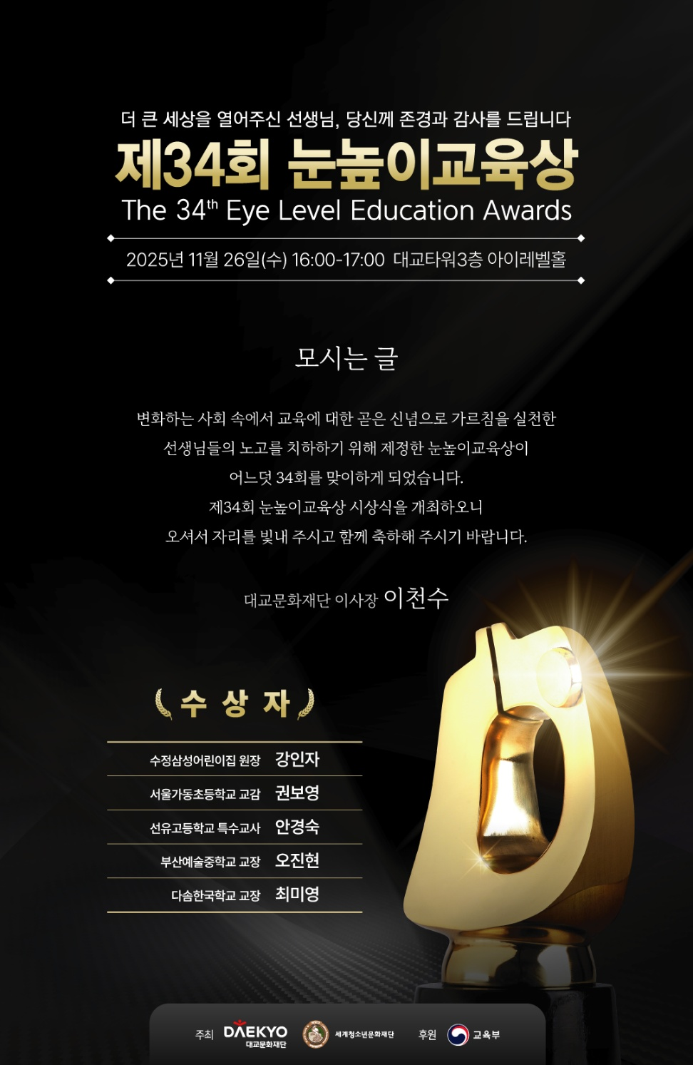 한편 눈높이교육상은 대교문화재단이 주최하고 세계청소년문화재단이 주관하며, 교육부가 후원한다.