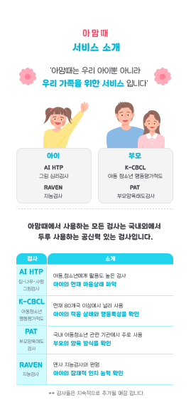 AI HTP : 아이의 현재 마음상태 파악(아동에게 활용도 높은 검사) K – CBCL : 아이의 적응 상태와 행동특성 확인(현재 80개 국가에서 사용 중) PAT : 부모의 양육태도 확인(국내 아동심리 검사 기관에서 사용) RAVEN : 아이의 잠재적 인지능력 확인(멘사의 지능검사 원형) 아맘때”프로그램의 특징은 부모가 아이의 심리상태를 검사와 확인을 하고 싶고 또한 상담을 받고 싶어도 고비용과 부모가 시간을 별도로 마련해야하는 어려움 그리고 대면 상담에 대한 부담감 등 여러가지 제한요소가 있었다. ㈜인사이터는 이로한 문제점을 개선하고 아동과 부모님들에게 실질적인 도움을 드리고자 이와같은 “아맘때”프로그램을 개발하여 선풍적인 인기몰이를 하고 있다고한다.