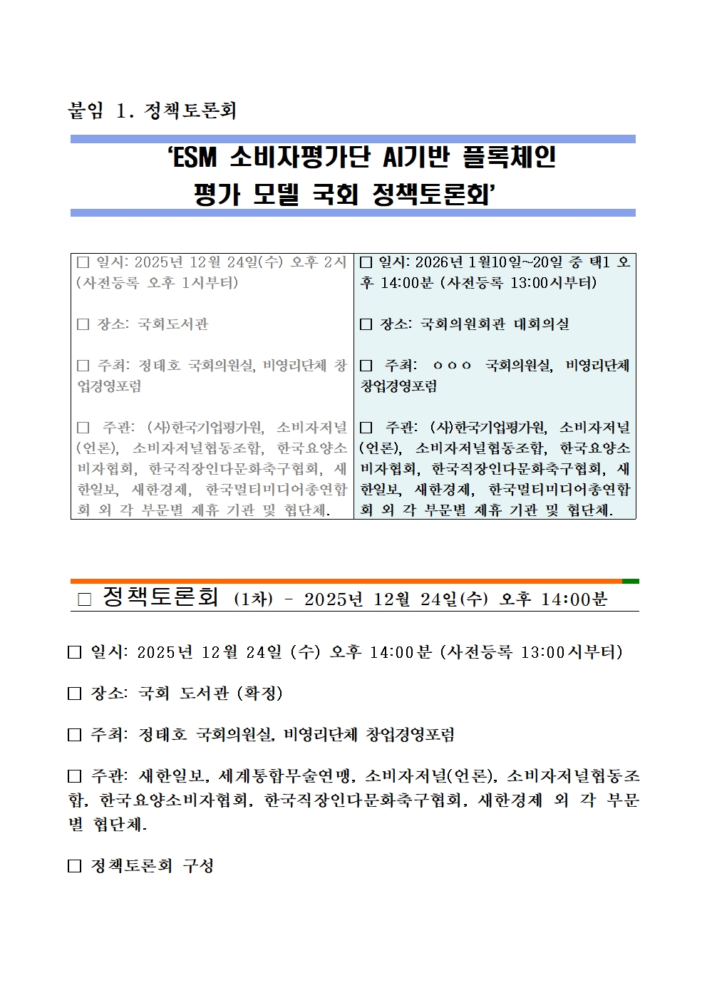 ESM 소비자평가단 AI기반 블록체인 평가 모델 국회 정책토론회 및 임명, 평가 발표식 개최한다