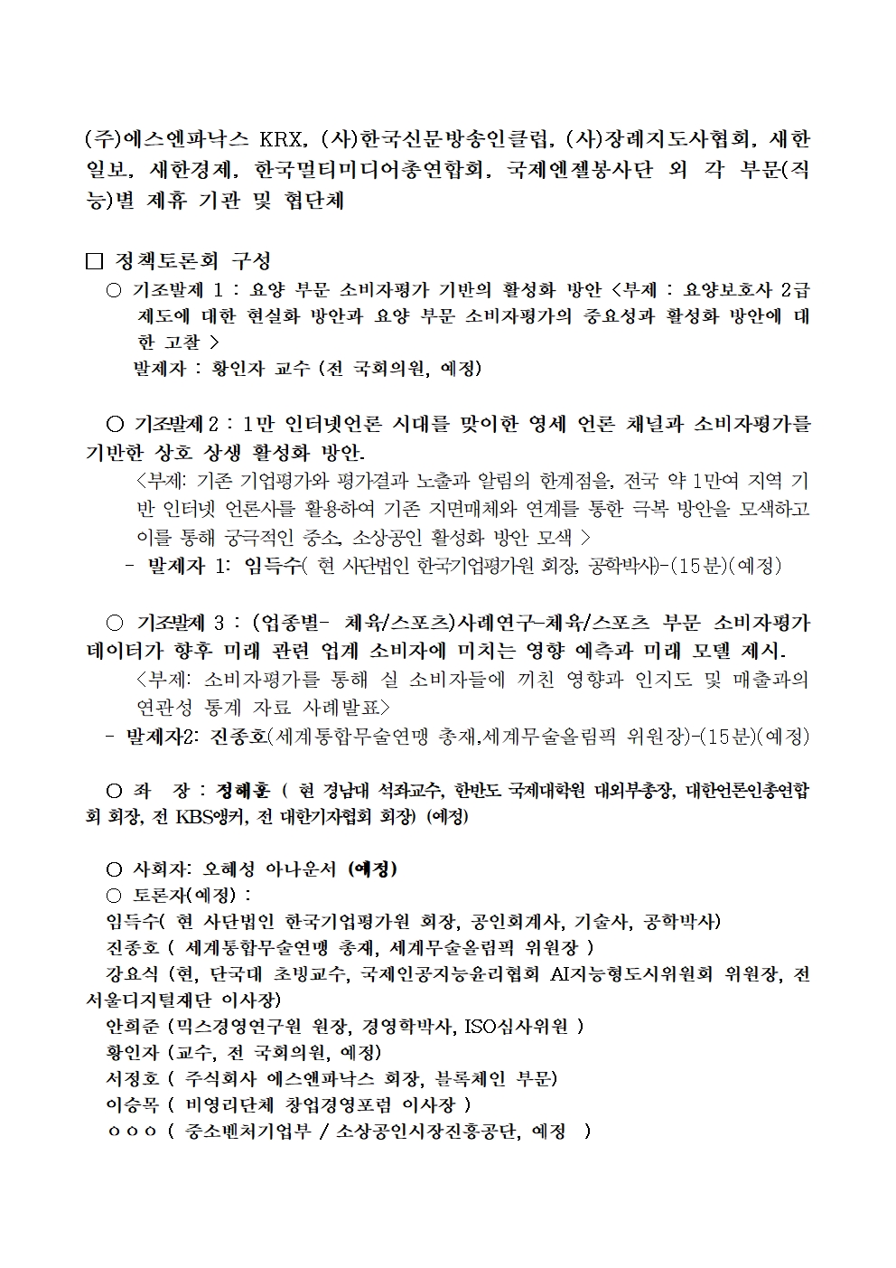이번 정책토론회에서는 제8회 대한민국소비자평가우수대상시상식이 추가돼 국회의원, 시도지사, 군수 등 정치인은 물론 우수한 기업들이나 단체 등이 대거 수상 및 참석할 것으로 예상된다.
